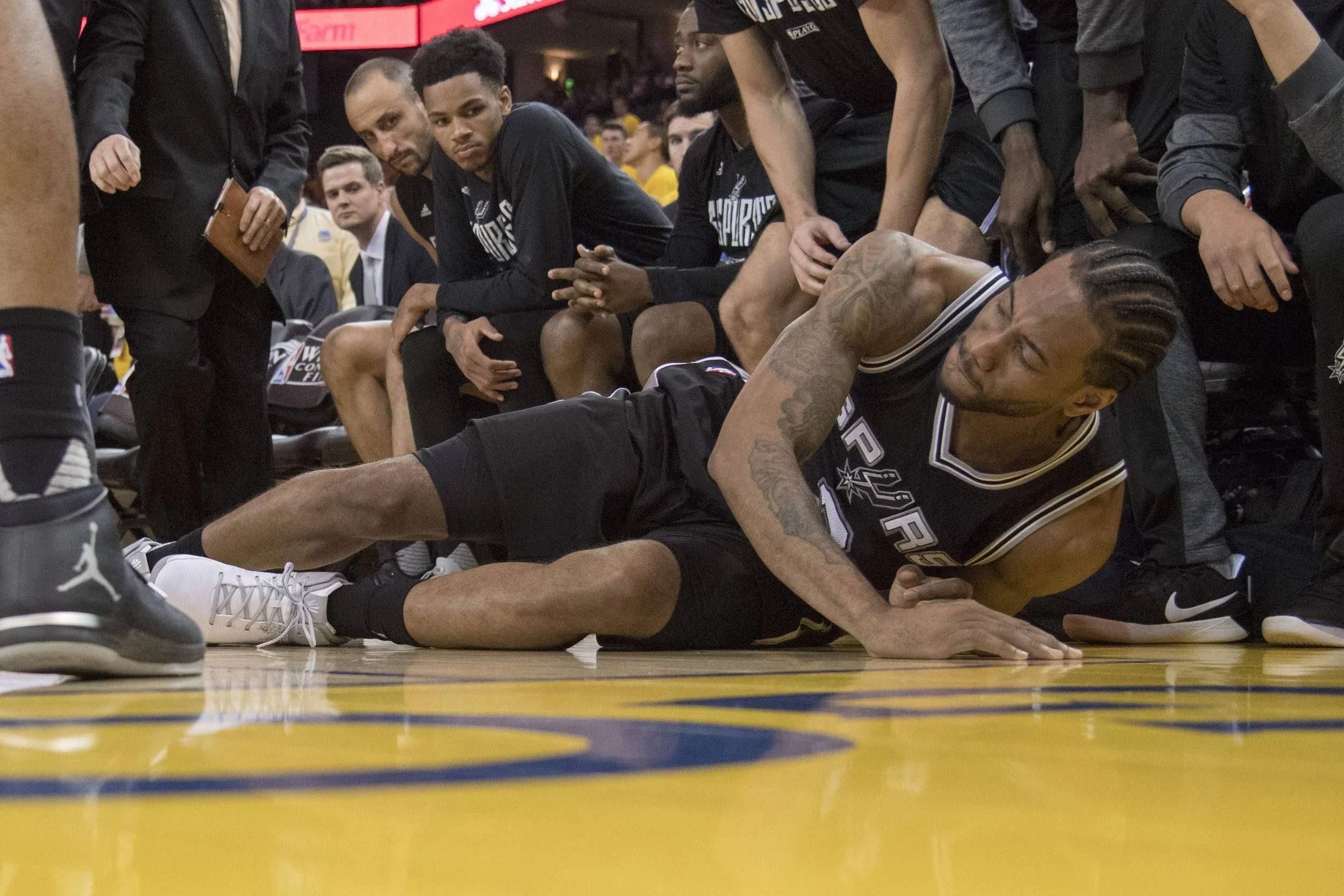 Why was it clear as day? Let's call a spade a spade. Our one 2017 NBA All-Star was single-handedly outshining Golden State's four 2017 NBA All-Stars combined. Kawhi Leonard was conducting the game with such precision, he had the Warriors quartet sucking wind. In other words, he was kicking their brass. There is only one player comparison to make in regards to the way Kawhi was dominating Sunday's matinee before being sidelined. Michael Jordan. It was simply breathtaking. To be able to do what he was doing in Game 1 to a team that features two former NBA MVPs and four perennial All-Stars, Kawhi has officially become His Airness-level dominant. When the player of the game limped to the locker room at the 7:52 mark of the third quarter (after 24 minutes of action), he had 26 points (7-13 from the field, 11-11 from the line), eight rebounds, three assists, and one steal. Oh...and the #BlackAndSilver were beating the consensus title favorites in their building by 23. After Kawhi left, the Warriors immediately went on an 18-0 run and, despite the heroic effort of our remaining players, ended up outlasting the Spurs by two points to win Game 1, 113-11. (We'll choose not to talk about Kevin Durant's blatantly obvious double-dribble that wasn't called and gave his Thunder...err, I mean Stephen Curry's Warriors an undeserved final--margin-difference-making bucket.) Congratulations on your "historic" comeback, Golden State. It certainly did become easier to beat the Chicago Bulls too when Michael Jordan "retired" from basketball to pursue his passion for whiffing at minor league curve balls.